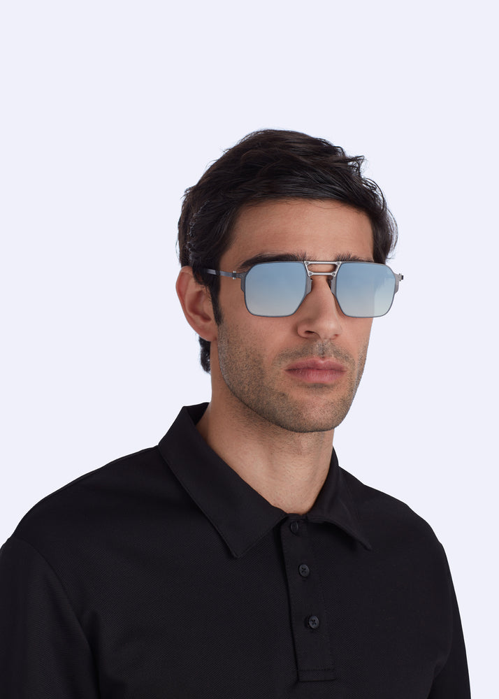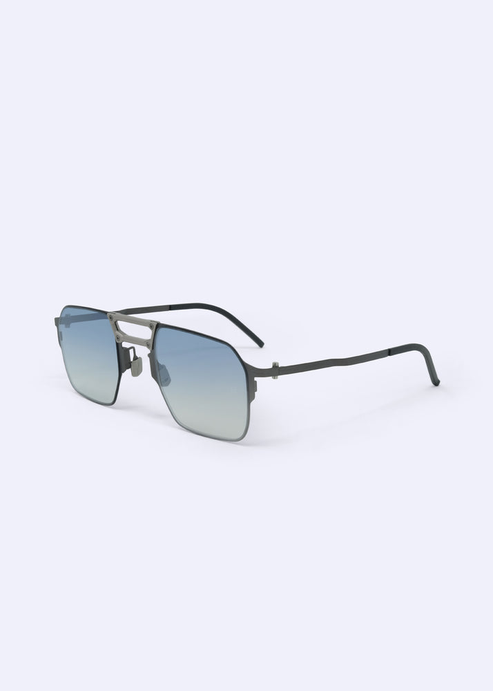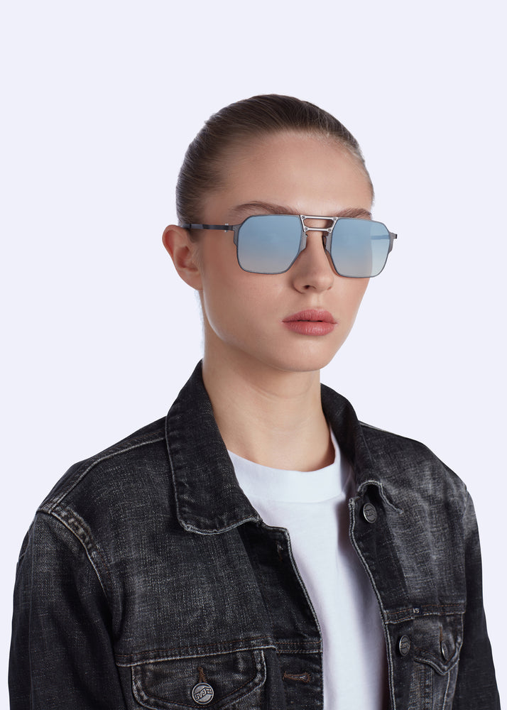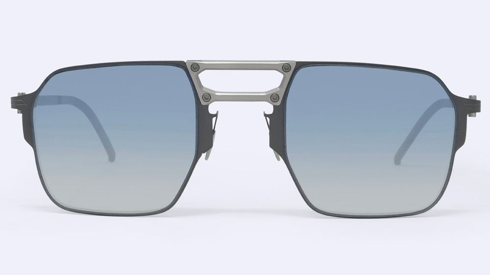 A sophisticated pair of geometric aviator-inspired sunglasses featuring a distinctive industrial design with visible screws on the bridge piece. The frame combines modern angular shapes with classic elements, sporting a gunmetal grey finish and gradient blue lenses. The architectural bridge design adds a technical, contemporary edge while maintaining a luxurious aesthetic. The sunglasses demonstrate excellent craftsmanship with precise metalwork and clean lines throughout the design.