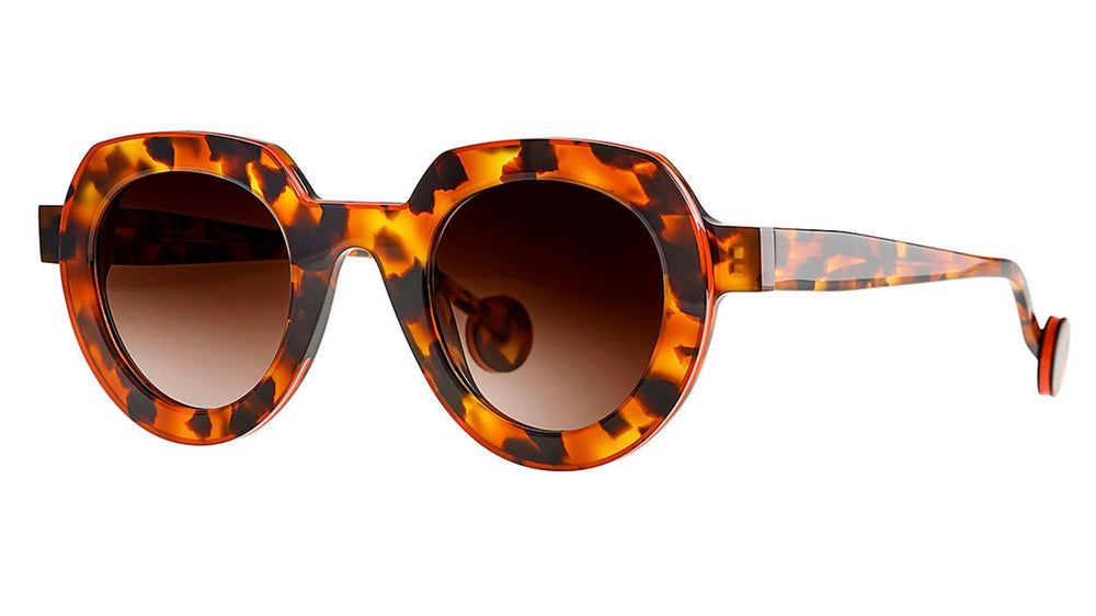 These statement sunglasses feature a bold round silhouette with thick tortoiseshell acetate frames in warm amber and dark brown tones. The oversized circular shape gives them a dramatic retro-inspired look, while the gradient brown lenses add sophistication. The chunky frame construction creates an artistic, avant-garde aesthetic thats both fashionable and eye-catching.