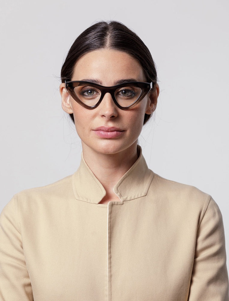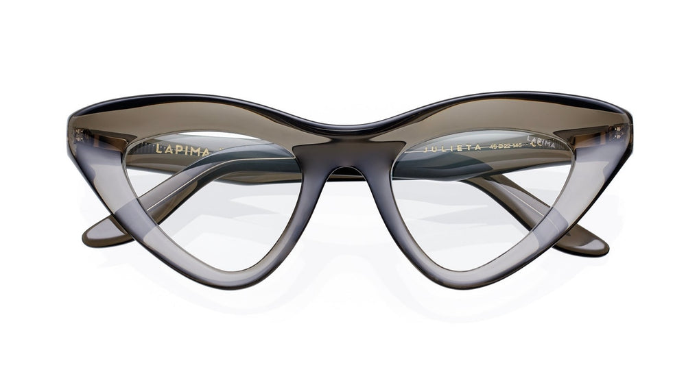 These LAPIMA JULIETA sunglasses feature an elegant cat-eye silhouette in a sophisticated translucent grey acetate. The frames have a dramatic upswept shape with smooth curves and a seamless design. The medium-thickness construction provides durability while maintaining a refined aesthetic. The lenses are clear and the overall design exudes a contemporary feminine charm with vintage-inspired elements.