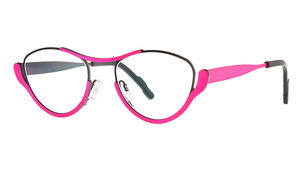 These distinctive cat-eye glasses feature a unique two-tone design with bright pink accents against a silver metallic frame. The silhouette has an upswept, playful shape characteristic of cat-eye styles, but with a modern, architectural twist. The frames combine sleek metalwork with vibrant pink elements along the top rim and temple arms, creating a bold yet elegant look. The design strikes a balance between fashion-forward statement piece and wearable everyday eyewear.