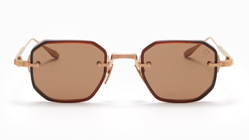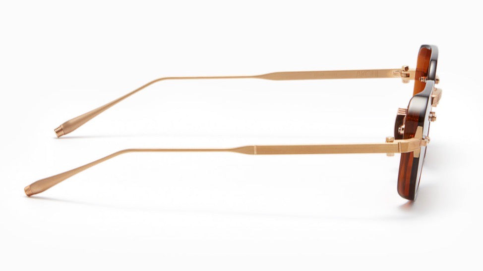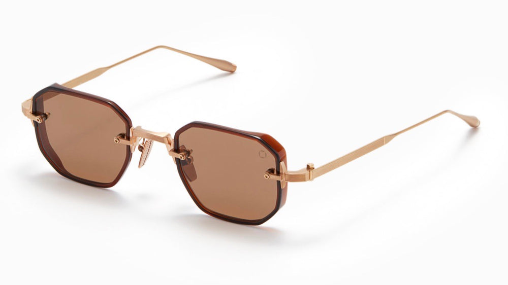 A sophisticated pair of geometric sunglasses featuring a minimalist gold metal frame with a distinctive angular shape. The design showcases brown-tinted lenses within an elegant gold metal structure with delicate nose pads. The frame construction is notably thin and refined, creating a lightweight and modern aesthetic. Small decorative screws visible at the frame corners add a subtle industrial detail. The overall design balances contemporary geometric styling with classic luxury appeal.