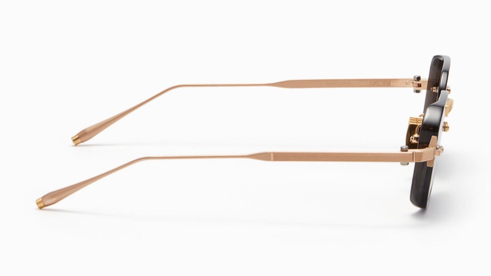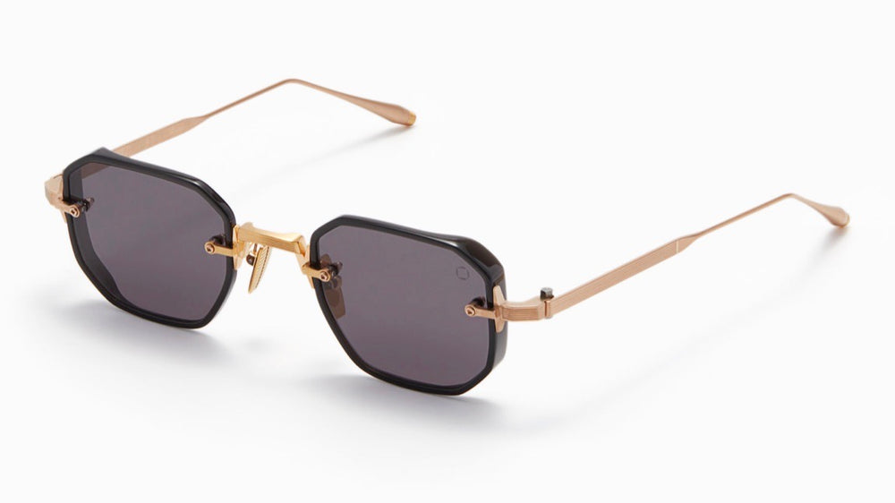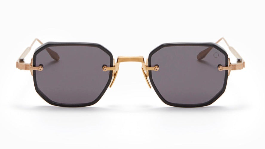 Luxurious geometric sunglasses featuring a sophisticated gold metal frame with an architectural design. The unique angular lenses are set in a minimalist rimless bottom style with geometric angles. The thin gold temple arms and bridge create an elegant, modern aesthetic. The grey-tinted lenses complement the metallic frame while providing excellent sun protection. These sunglasses blend contemporary geometric styling with classic luxury materials for a distinctive look.