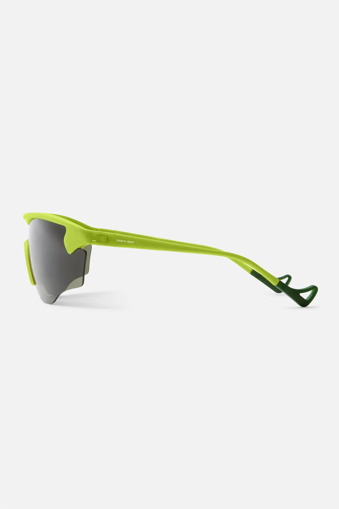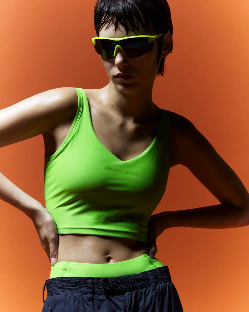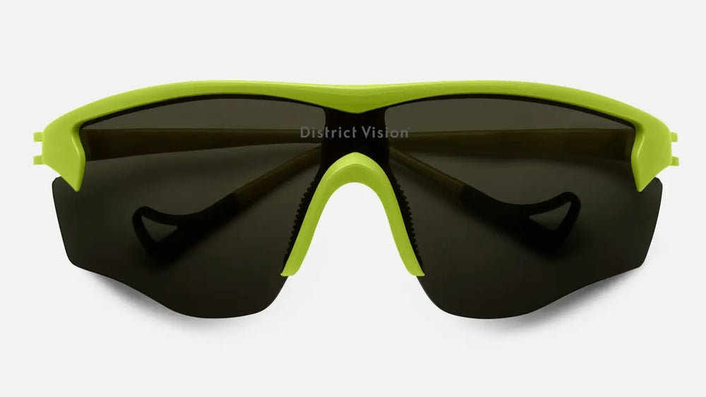 Modern athletic performance sunglasses with a sleek, minimalist design. The frame features a distinctive lime green color scheme with dark tinted lenses. The wraparound style offers excellent coverage and wind protection, typical of high-end sports eyewear. The seamless one-piece lens design and aerodynamic profile suggest these are optimized for activities like running or cycling. The District Vision branding is subtly visible on the lens.