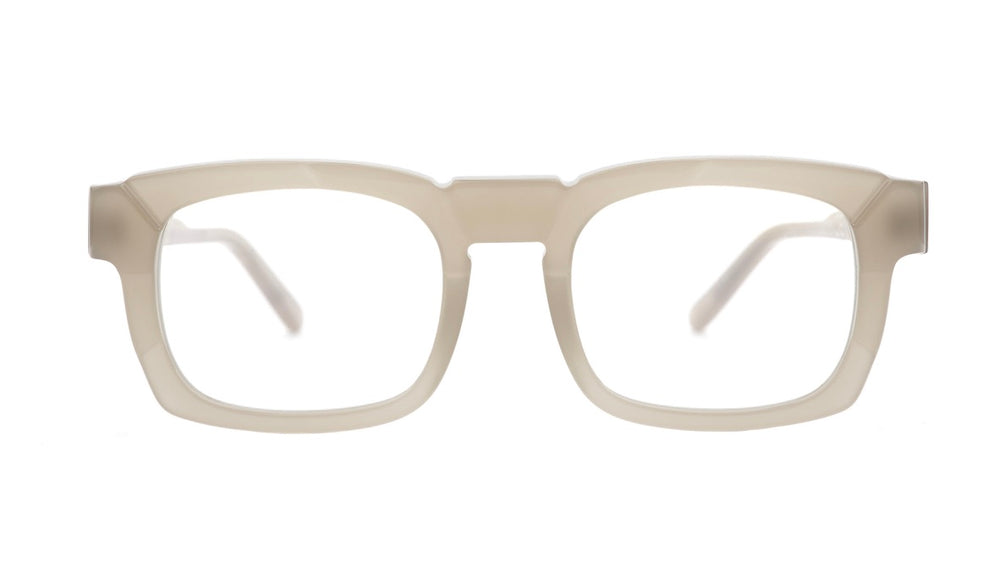 These are bold, architectural eyeglasses featuring an oversized square frame in a sophisticated matte grey finish. The frames have a distinctively chunky, sculptural quality with clean geometric lines and a modern minimalist aesthetic. The thick temples match the substantial front frame, creating a cohesive contemporary look. The saddle bridge is well-proportioned to balance the bold frame design. The transparent lenses and monochromatic grey color scheme give these glasses a refined, intellectual appeal suitable for creative professionals.