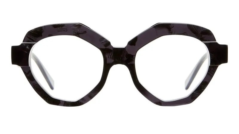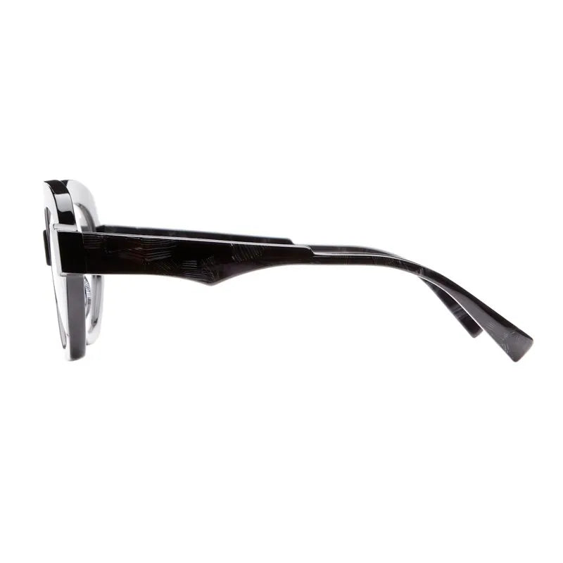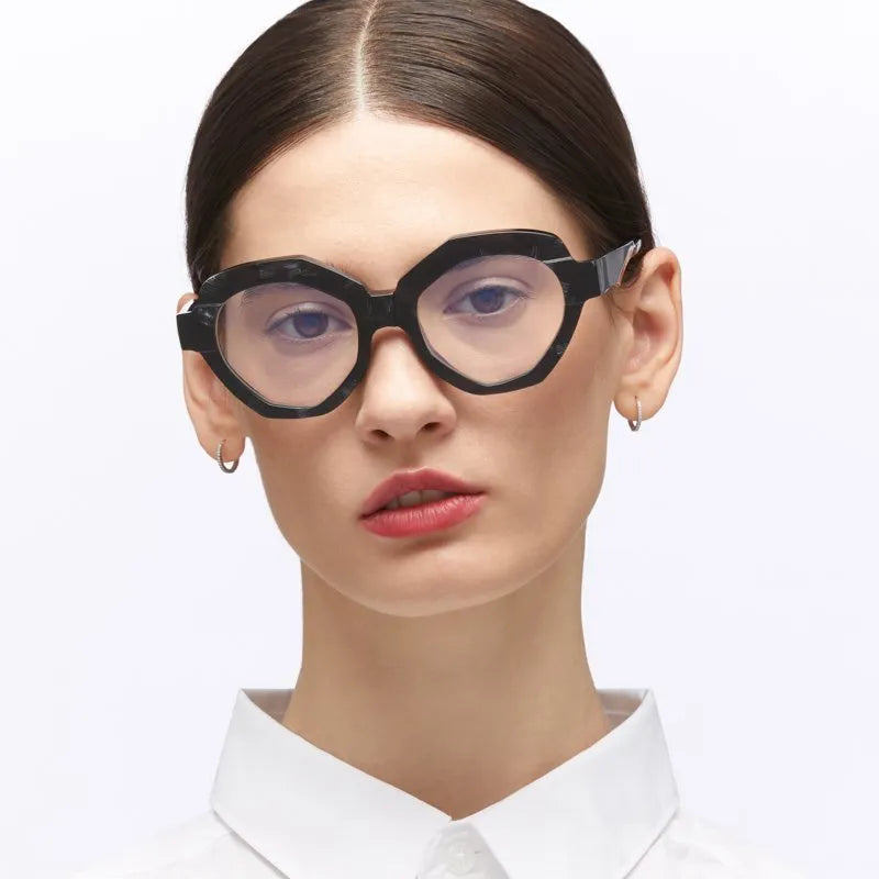 These are bold, avant-garde geometric frames with a distinctively thick, sculptural construction. The frames feature an angular, faceted design that creates an artistic, architectural appearance. Made from high-quality black acetate with a matte finish, the frames have an oversized hexagonal-inspired shape with dramatic angles and edges. The thick temples complement the substantial front frame design. The overall aesthetic is dramatic and fashion-forward, perfect for those wanting to make a strong style statement.