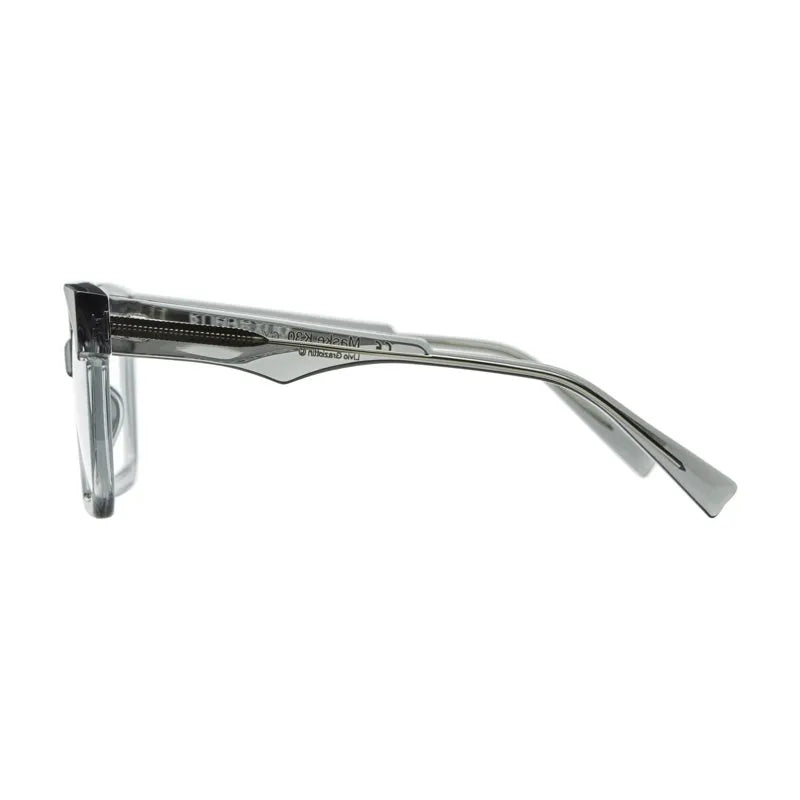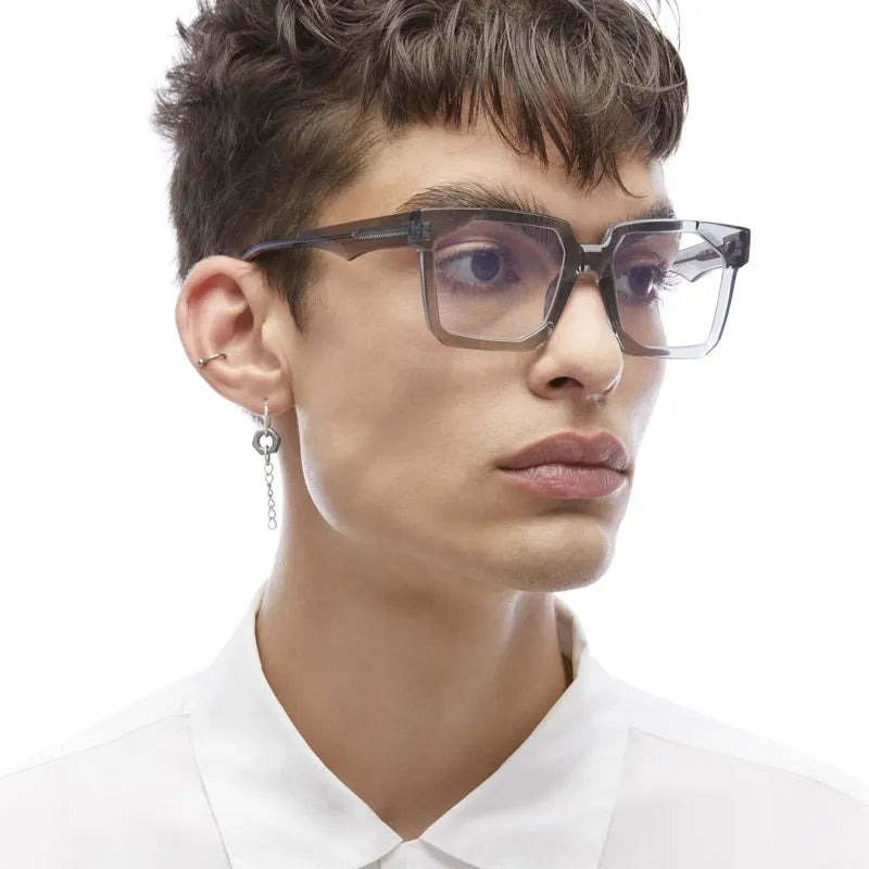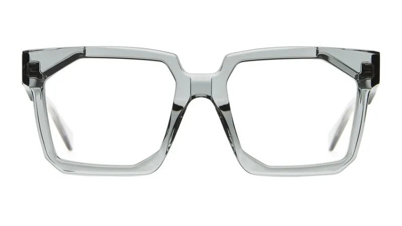 These are bold oversized geometric glasses with a striking transparent grey acetate frame. The design features a distinctive chunky square-geometric silhouette with sharp angular corners and a substantial frame thickness. The bridge and temple arms maintain the same substantial grey translucent material, creating a cohesive contemporary look. The straight-edged design and substantial proportions make these glasses a dramatic statement piece with a modern architectural aesthetic.