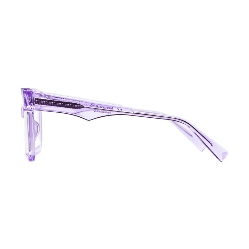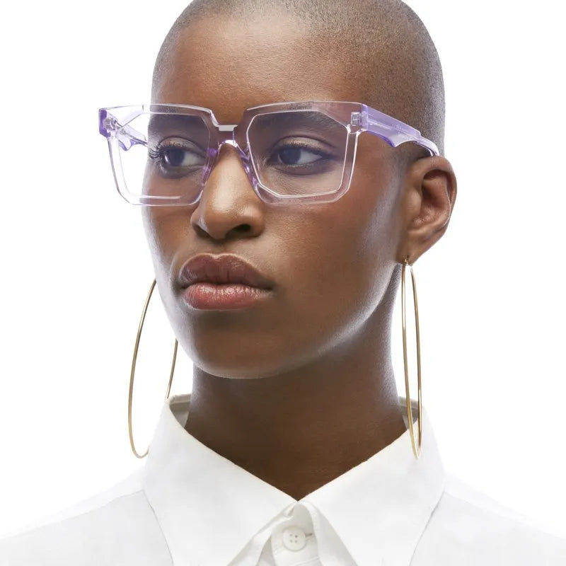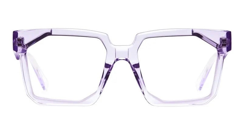 This is a bold statement piece featuring an oversized square frame in a translucent purple crystal acetate. The frames have a distinctive geometric angular cut with sharp corners and a prominent thick bridge. The overall aesthetic is avant-garde and architectural, with clean lines and a modern minimalist approach. The transparent purple tint creates an ethereal quality while maintaining its substantial presence. The temples maintain the same thickness and material as the front frame, creating a cohesive look.