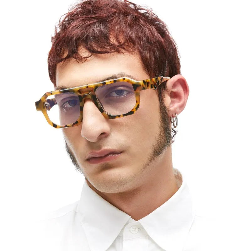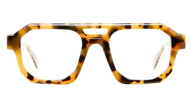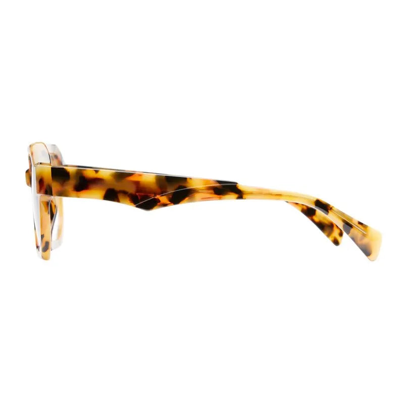 These are bold, statement-making geometric glasses featuring a distinctive chunky acetate frame in a sophisticated tortoise pattern. The design showcases an architectural approach with sharp angles and a strong brow line. The frames have a vintage-inspired feel with modern geometric interpretation, creating a striking silhouette thats both intellectual and fashion-forward. The bridge structure is pronounced and integrated seamlessly into the substantial frame design. The overall aesthetic is luxurious and avant-garde, perfect for those seeking distinctive eyewear with strong character.