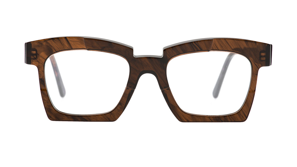 Striking oversized geometric frames featuring a bold angular design with a distinctive flat top and squared-off corners. The frames showcase a rich woodgrain-like brown pattern throughout, giving them a unique natural appearance. The thick, substantial construction creates a strong architectural presence, while the transparent lenses maintain a clean, modern aesthetic. The saddle bridge adds to the avant-garde design, making these glasses a bold fashion statement piece that combines contemporary geometric styling with organic textural elements.