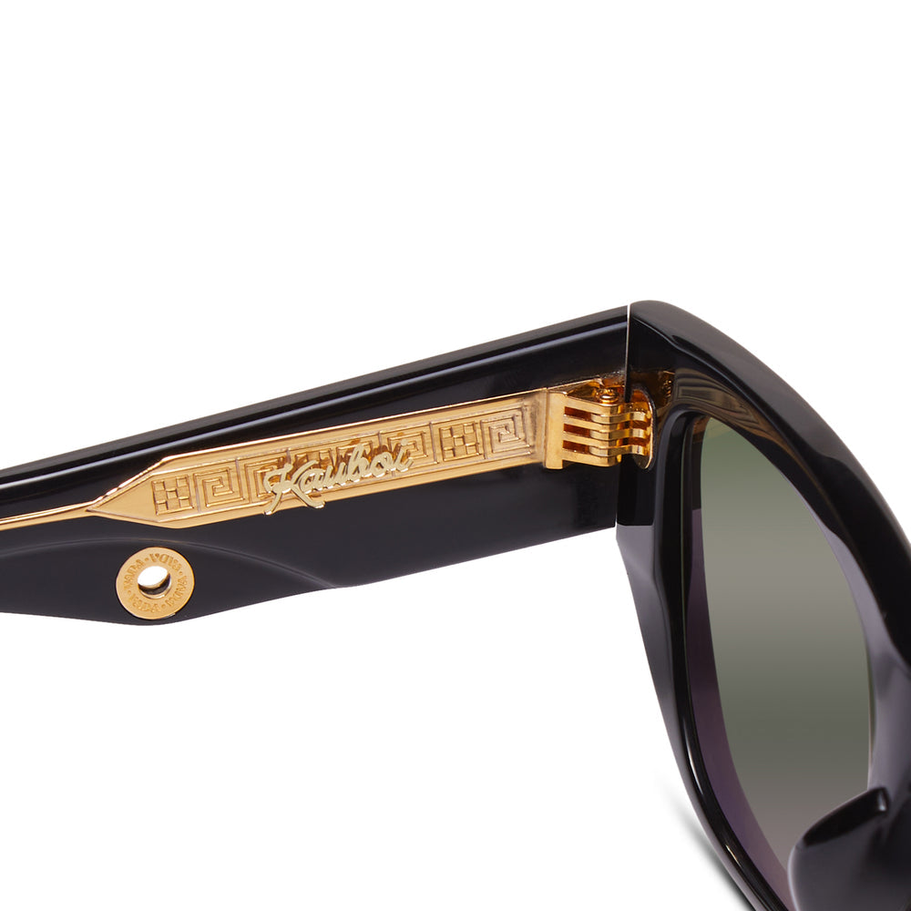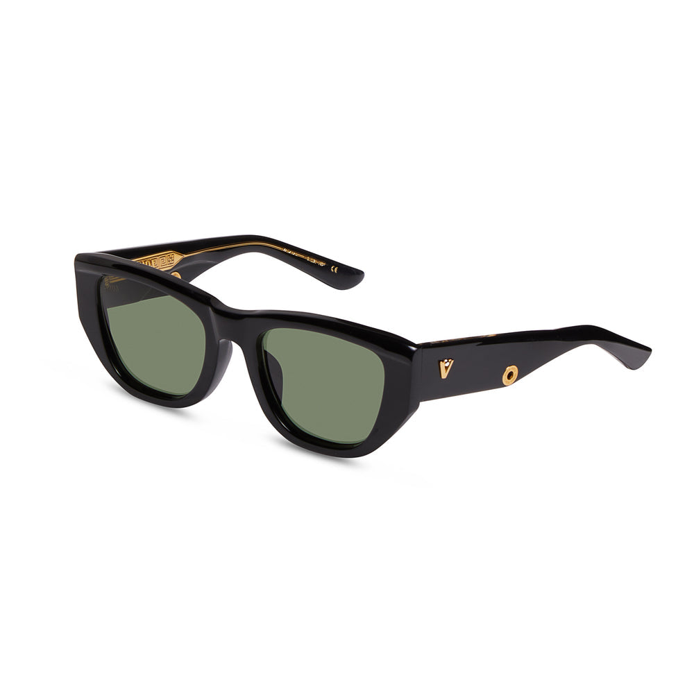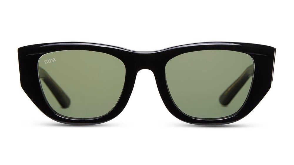 This bold and striking pair of sunglasses features a distinctive geometric shape with thick black plastic frames. The design has an avant-garde, architectural quality with pronounced angles and a substantial build. The green-tinted lenses provide a classic look while complementing the frames dramatic silhouette. The sunglasses have a clean, contemporary aesthetic that would appeal to fashion-forward individuals seeking a statement piece. The chunky frame construction suggests durability and premium quality, while the overall design maintains a balanced proportion despite its bold presence.
