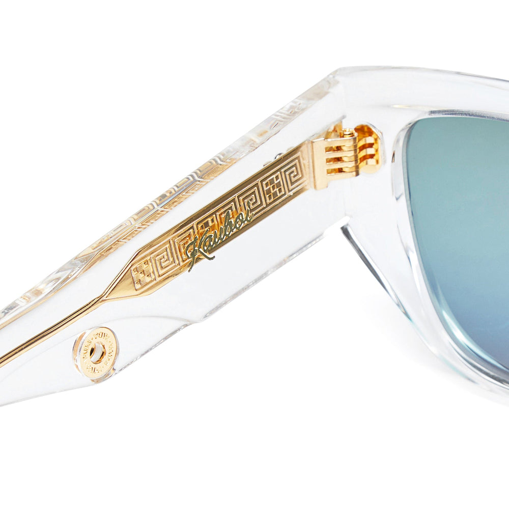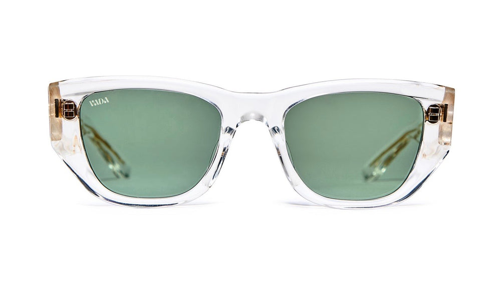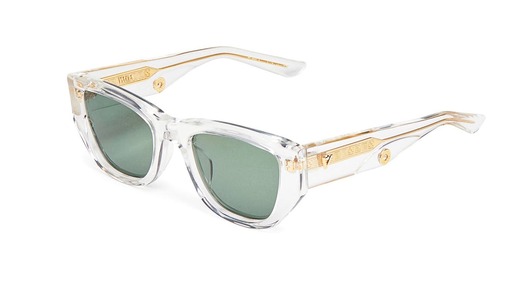A striking pair of chunky transparent acetate sunglasses with a modern square silhouette. The frame features a clear crystal finish with subtle golden temple hardware accents. The frames have a substantial, architectural feel with clean lines and a bold presence. The green-tinted lenses provide a classic look while offering sun protection. The design balances retro inspiration with contemporary styling through its transparent material choice and geometric shape.