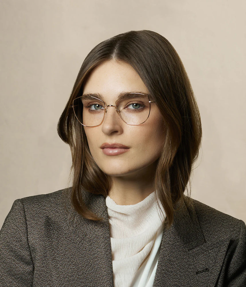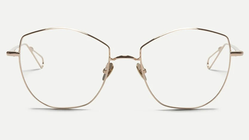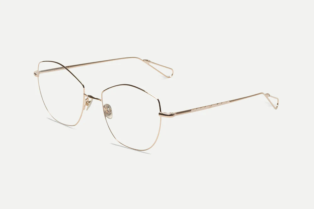 These elegant gold-tone metal frames feature a distinctive geometric silhouette with clean lines and delicate proportions. The frames have a sophisticated, minimalist design with angular edges that create a modern, architectural look. The thin metal construction gives them a lightweight and refined appearance, while the adjustable nose pads ensure a comfortable fit. The frames subtle sheen and premium craftsmanship reflect a luxurious, contemporary aesthetic that works well for both casual and formal settings.