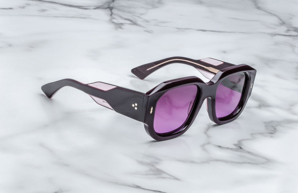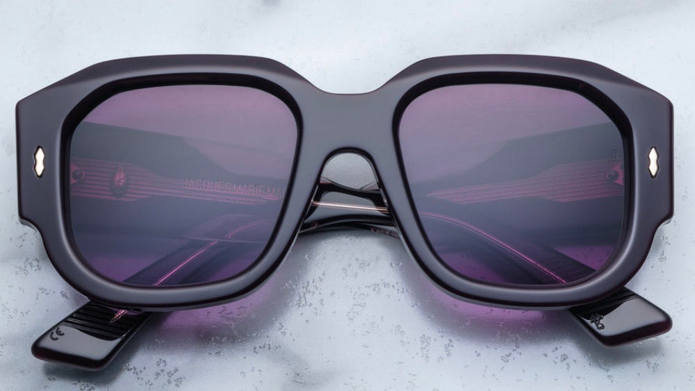 A bold, oversized square-framed designer sunglasses from Jacques Marie Mages collection. The frames feature a chunky, architectural design with a matte black finish and striking purple-tinted lenses. The substantial frame construction gives these sunglasses a luxurious, statement-making presence. Small decorative diamond-shaped silver accents appear on both temples, adding a subtle designer touch. The overall aesthetic is sophisticated and modern while maintaining a timeless appeal.