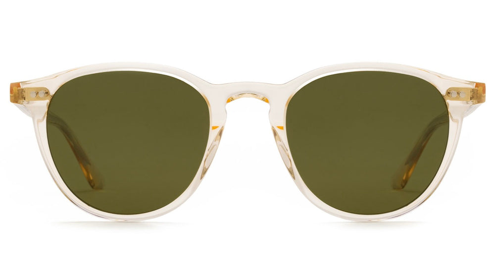 Classic round sunglasses featuring a translucent crystal acetate frame with subtle gold accents at the temples. The green-tinted lenses provide excellent sun protection while maintaining a sophisticated aesthetic. The frame has a clean, minimalist design with smooth curves and comfortable proportions, making it versatile for various face shapes. The saddle bridge offers comfortable fit, while the subtle gold temple details add a refined touch to this timeless design.