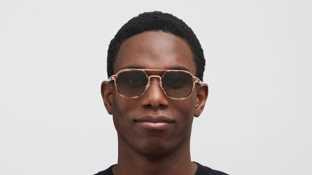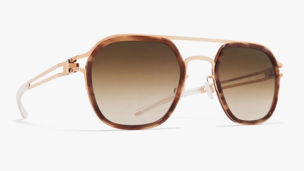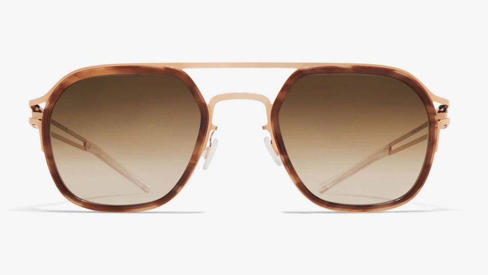 These MYKITA sunglasses feature a sophisticated geometric silhouette with a distinctive double bridge design. The frame showcases a luxurious bronze metallic finish with brown gradient lenses that fade from dark to light. The construction appears both elegant and sturdy, with sleek architectural lines and clean angles that create a contemporary, high-end aesthetic. The sunglasses demonstrate excellent craftsmanship with finely detailed temple arms and a balanced proportion between the frames and lenses. The overall design strikes a perfect balance between modern sophistication and timeless style.