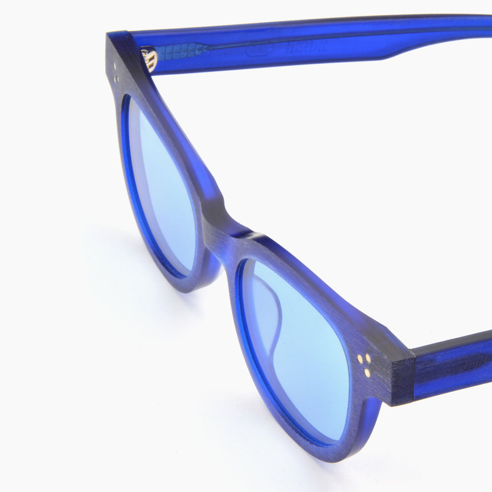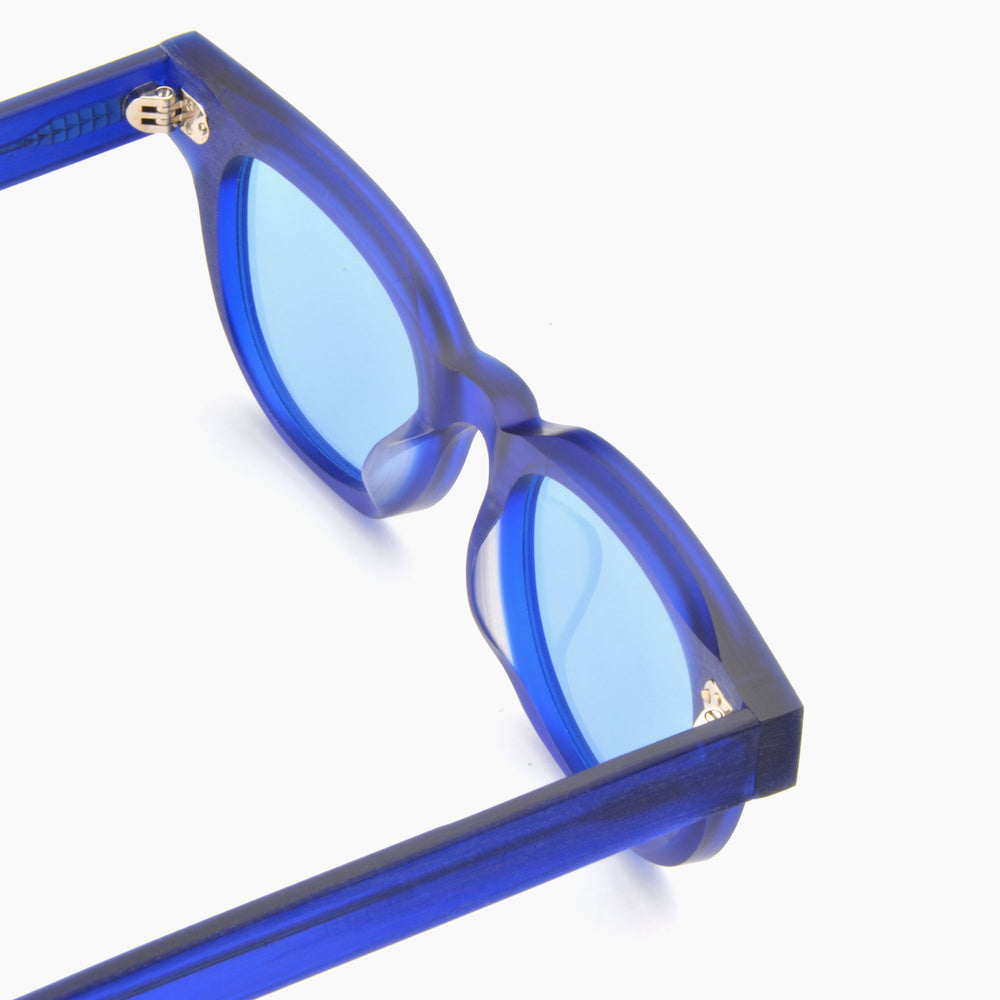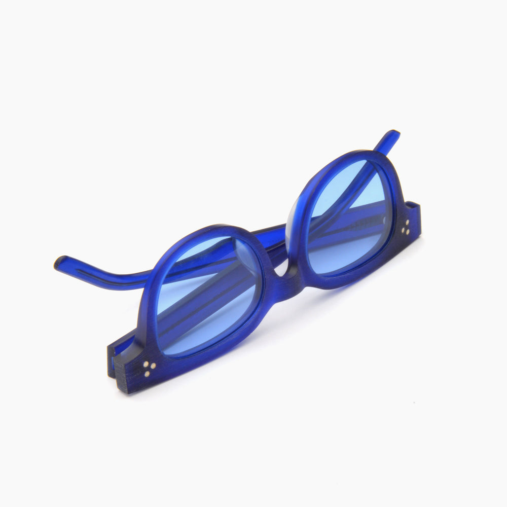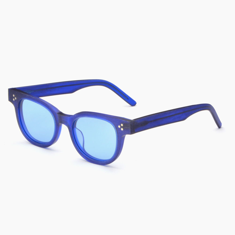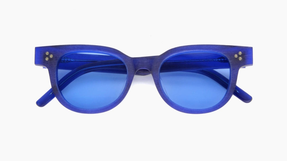 A striking monochromatic pair of sunglasses in a deep royal blue colorway. The frame features a classic round silhouette with a contemporary twist, made from what appears to be translucent blue plastic material. Small decorative studs are visible on the front corners of the frame, adding a subtle design detail. The sunglasses have a clean, modern aesthetic with blue-tinted lenses that match the frame color, creating a cohesive look. The design strikes a balance between vintage inspiration and modern styling, making it suitable for various face shapes and style preferences.