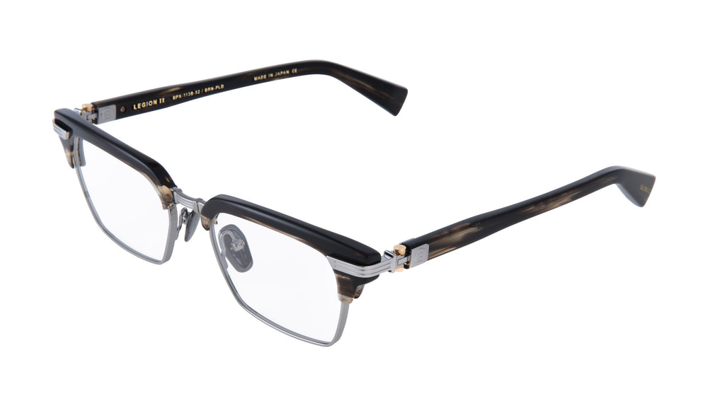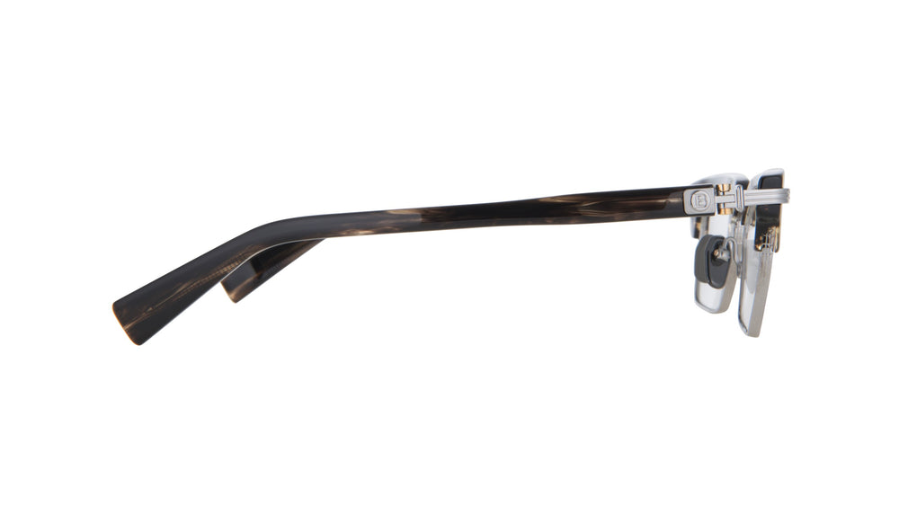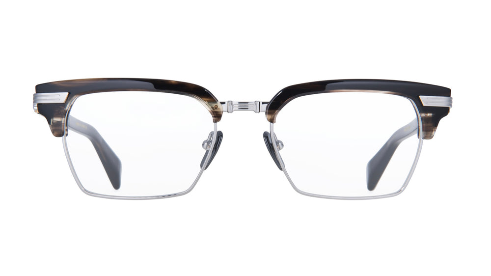 These sophisticated browline glasses feature a unique tortoiseshell pattern on the upper frame complemented by silver metallic accents. The design combines classic and modern elements with a semi-rimless bottom, creating a refined professional look. The temple arms incorporate both tortoiseshell and metallic elements for a cohesive aesthetic. The sleek nose bridge with adjustable nose pads ensures comfort and proper fit. These frames represent a perfect balance of luxury and functionality with their architectural styling and premium materials.