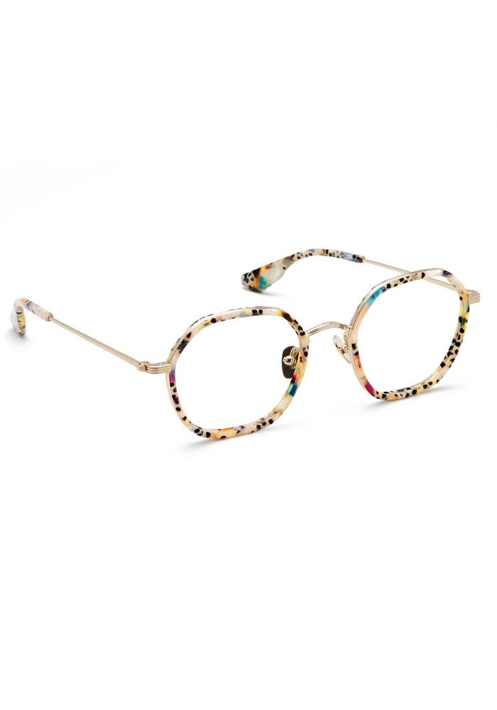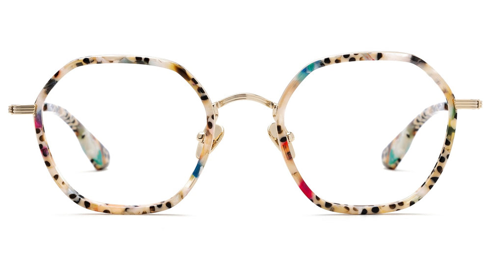 These stylish geometric frames feature a unique multi-colored tortoiseshell pattern with splashes of blue, pink, and black spots on a cream base. The frames combine a delicate gold-toned metal bridge and temples with patterned acetate rims. The design is sophisticated yet playful, with angular geometric shapes that create an intellectual, artistic appearance. The frames have a vintage-inspired aesthetic while maintaining a contemporary edge, making them suitable for both professional and casual settings.