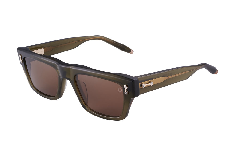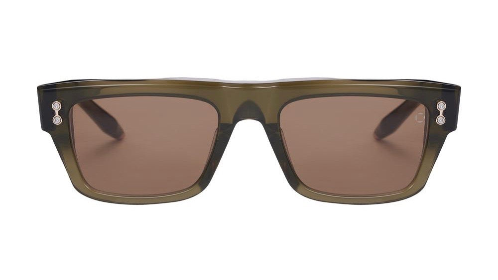 Modern and sophisticated square sunglasses with a chunky acetate frame in a translucent olive-brown colorway. Features a bold, architectural silhouette with clean lines and subtle metallic detailing at the temples. The substantial build quality and minimalist design suggest luxury craftsmanship while maintaining a versatile, contemporary aesthetic suitable for everyday wear.