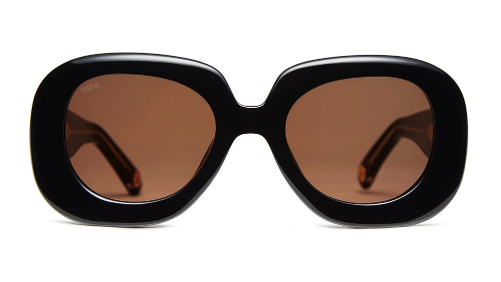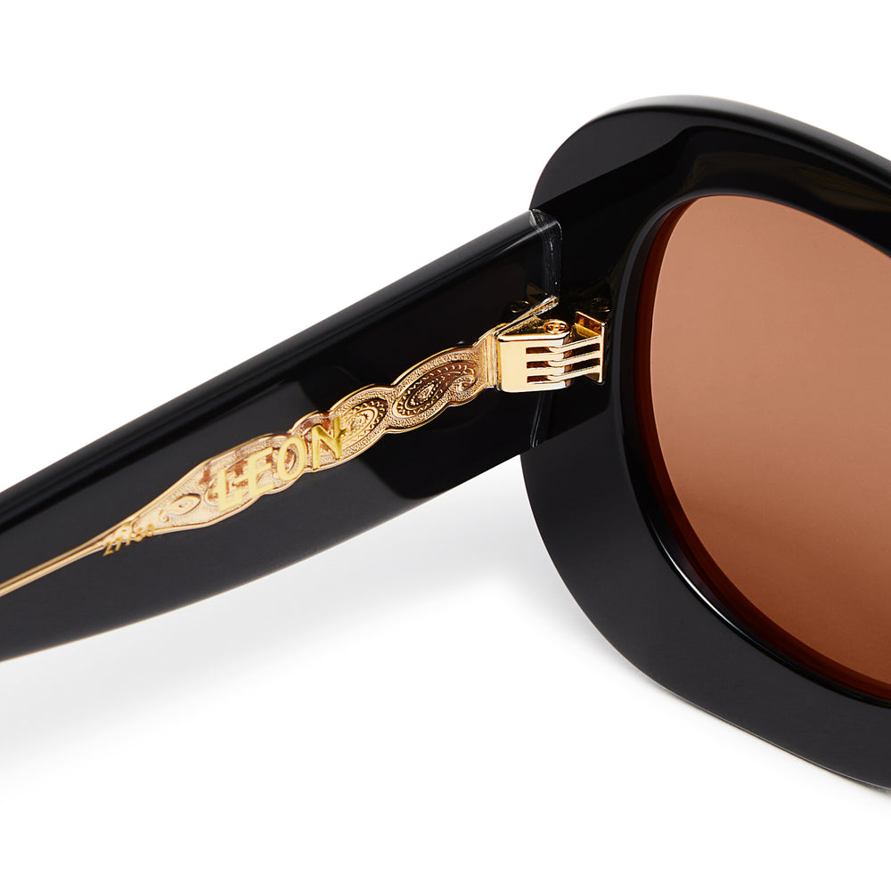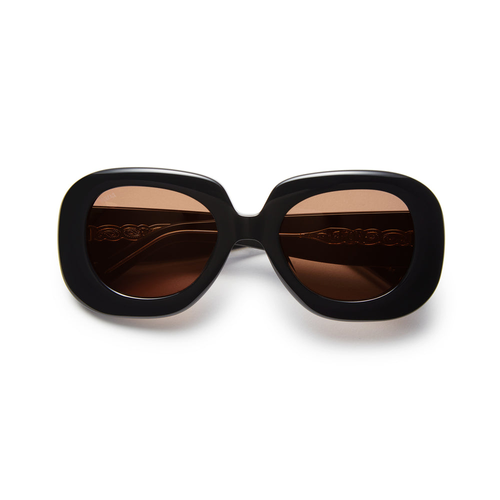 These oversized vintage-inspired sunglasses feature a dramatic thick black acetate frame with a bold silhouette. The dark brown tinted lenses create a sophisticated look while providing excellent sun protection. The chunky frame design and rounded oval shape give these sunglasses a luxurious, glamorous appeal reminiscent of classic 1960s Hollywood style. The wide temple arms and substantial saddle bridge complete the statement-making design.