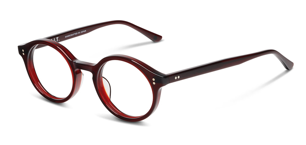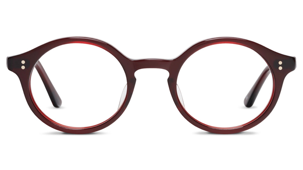 These are sophisticated round-framed glasses in a deep burgundy-brown acetate. The frame features a classic P3 round silhouette with subtle vintage-inspired details like the small rivets on the front corners. The frame has a substantial build quality with a glossy finish that transitions from darker to slightly lighter tones. The design exhibits clean lines and a timeless aesthetic that would complement both casual and formal looks. The saddle bridge provides comfortable nose support, while the rounded lenses offer a generous field of vision.