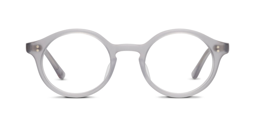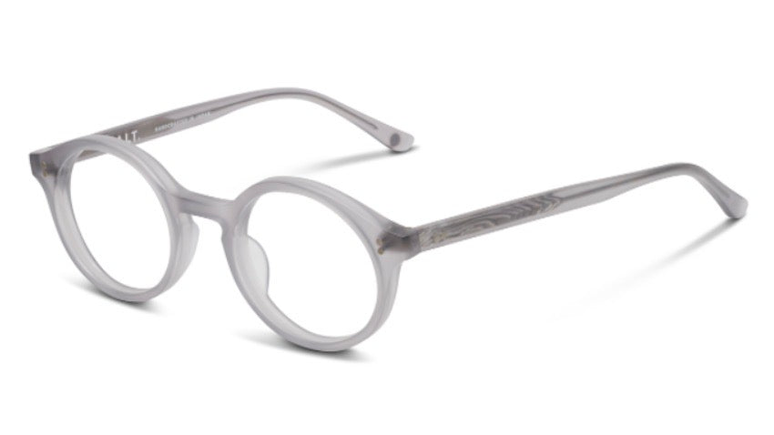 The Lewis frame from SALT. OPTICS features a sophisticated matte grey acetate construction with a classic round silhouette. The design showcases a clean minimalist aesthetic with subtle vintage inspiration. The frame has a medium thickness that provides durability while maintaining a refined look. The integrated saddle bridge flows seamlessly into the round eye rims. Small riveted details at the temple hinges add a subtle industrial accent.