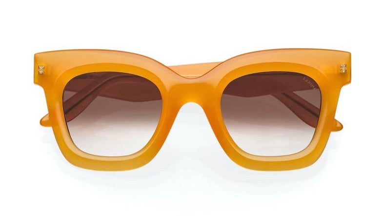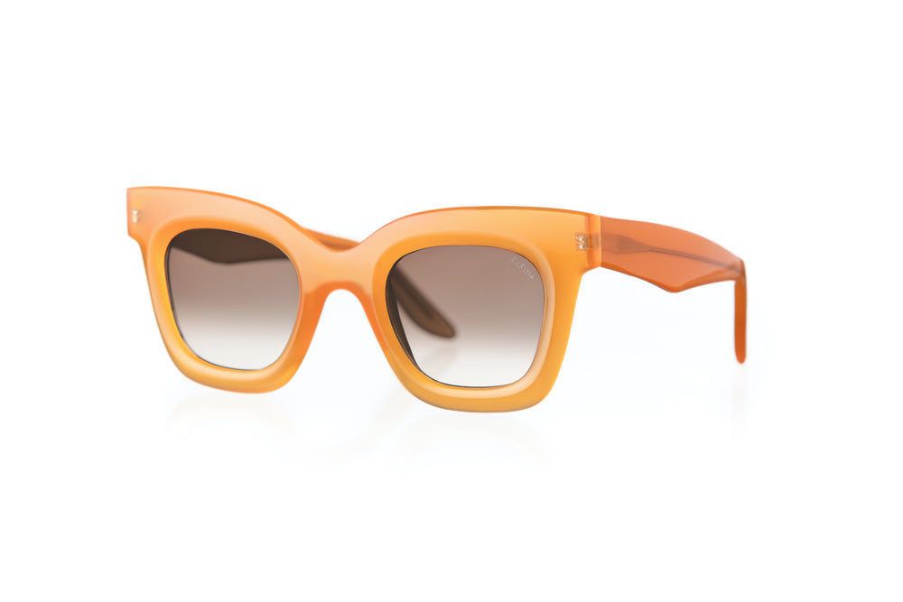 These are bold, statement sunglasses featuring a chunky square frame in a vibrant honey-orange color. The frames have a distinctive architectural quality with sharp, clean lines and substantial thickness that creates a strong geometric presence. The gradient brown lenses complement the warm tones of the frame. The design shows meticulous attention to detail with subtle metal accents at the temple hinges. The overall aesthetic is modern and fashion-forward, perfect for making a sophisticated style statement while providing sun protection. The oversized proportions and retro-influenced design make these sunglasses particularly striking.