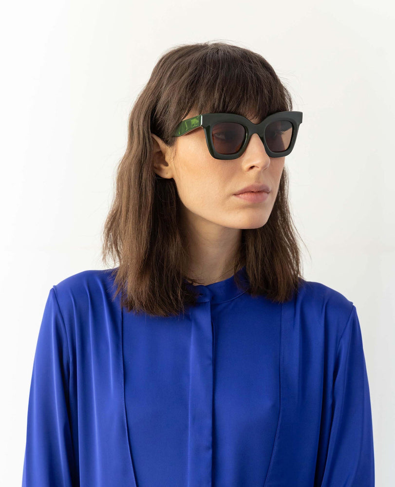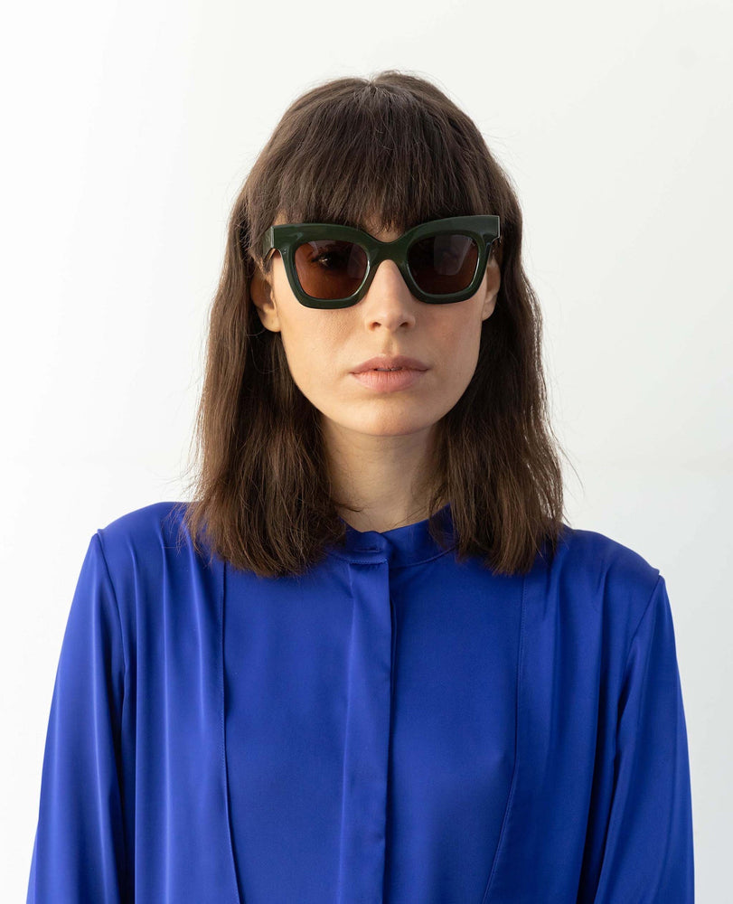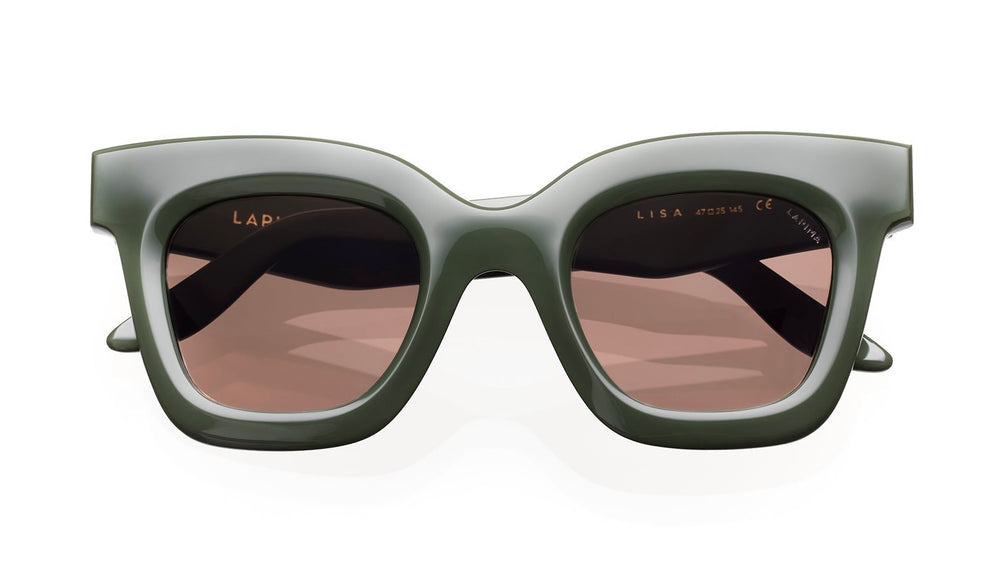 These are bold, architectural sunglasses featuring a chunky square frame in an olive-sage green color with rose-tinted lenses. The design is distinctively modern and oversized with sharp, geometric angles and a substantial acetate construction. The frames have a sophisticated matte finish and clean lines that create a striking silhouette. The substantial temple arms match the frame color and maintain the bold aesthetic. The design strikes a balance between contemporary fashion and timeless style, making it suitable for various face shapes.