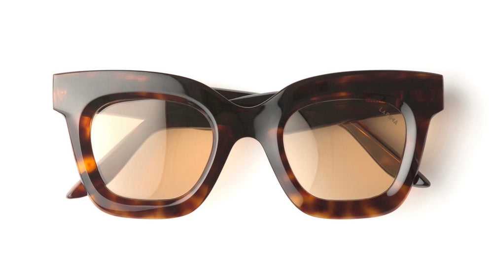 These bold oversized square sunglasses feature a luxurious tortoiseshell acetate frame with a distinctive chunky silhouette. The frames showcase beautiful amber and dark brown marbling patterns throughout. The lenses have a warm orange-tinted mirror finish that complements the tortoise coloring. The design has clean geometric lines with a substantial profile that makes a striking fashion statement while maintaining elegant proportions. The saddle bridge and thick temples are well-balanced with the oversized front shape, creating a sophisticated contemporary look.