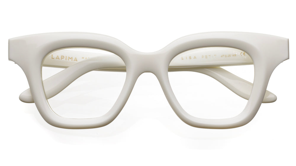 This is a bold, architectural pair of glasses featuring a chunky geometric frame in matte white acetate. The design has a distinctive sculptural quality with angular lines and a substantial profile. The frame has a modern, avant-garde aesthetic with clean lines and sharp angles. The chunky temples match the dramatic front perfectly, creating a cohesive design statement. The glasses have LAPIMA branding subtly engraved on the temple. These frames make a strong fashion statement while maintaining a sophisticated minimalist color palette.