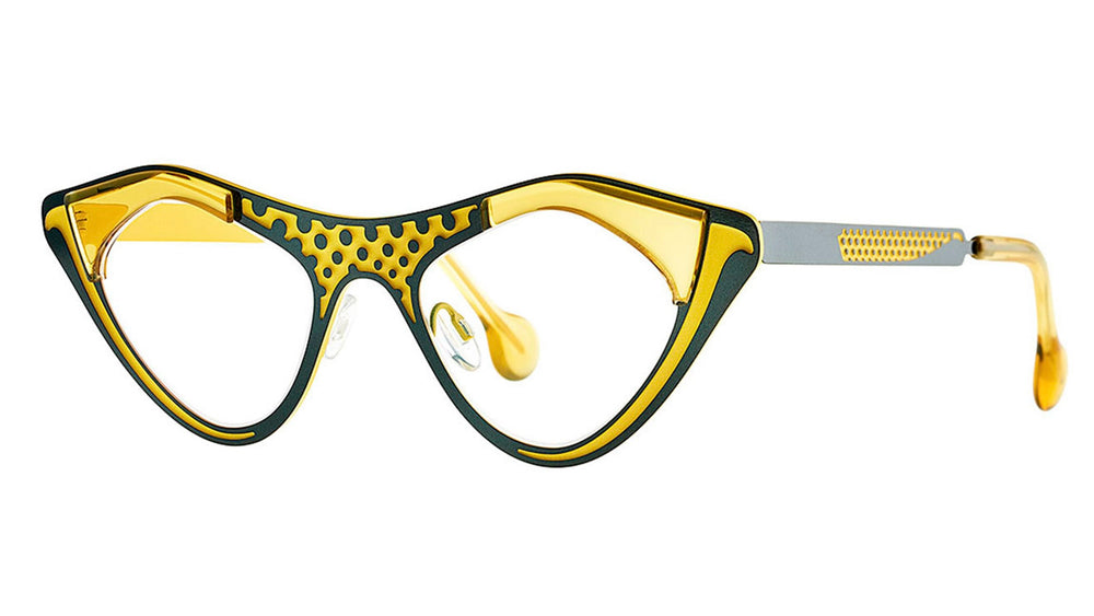 A striking retro-inspired cateye frame featuring a bold yellow and forest green color scheme with distinctive polka dot detailing on the upper temples. The frame combines modern styling with vintage flair, showcasing a dramatic upswept shape and unique cutout details. The design incorporates metallic accents and a sleek temple arm design with perforated detailing, creating an avant-garde aesthetic thats both playful and sophisticated. The contrast between the dark green trim and bright yellow body creates a dynamic, eye-catching look perfect for making a fashion statement.