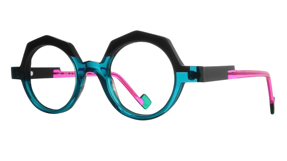 Bold geometric eyeglasses featuring an avant-garde design with a striking combination of turquoise blue and hot pink accents. The frame has an unconventional hexagonal-inspired round shape with angular top elements that create a distinctive architectural look. The frame front transitions from black to translucent turquoise, while the temple arms feature a two-tone design with black and hot pink components. The design showcases a contemporary artistic approach to eyewear with its asymmetrical elements and color blocking, making it perfect for those seeking a unique, fashion-forward aesthetic.