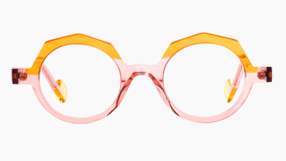 Two-toned acetate frames featuring a striking orange top rim that transitions into a translucent pink bottom section. The round silhouette has a quirky geometric edge with angular details at the temples. The design showcases a bold color-blocking approach while maintaining a lightweight and contemporary aesthetic. The frames have a distinctive architectural quality with clean lines and modern proportions.