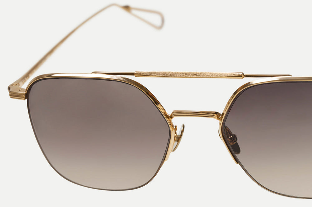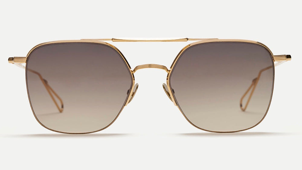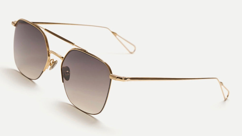 These elegant square-shaped sunglasses feature a sophisticated gold metal frame with a double bridge design. The gradient brown lenses create a refined look, while the thin profile and delicate nose pads ensure comfort. The geometric angles of the frame are softened by rounded corners, creating a balanced aesthetic that works well for any face shape. The sunglasses exhibit excellent craftsmanship with precise metalwork and clean lines throughout the design.