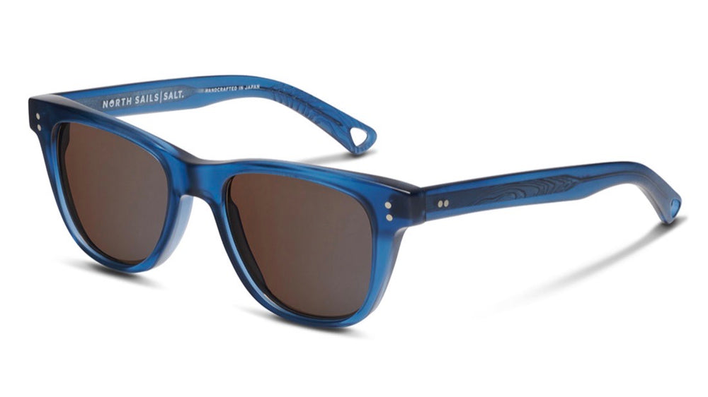 Classic wayfarer-style sunglasses featuring a translucent deep blue acetate frame with a sophisticated matte finish. The frame has clean geometric lines and a substantial build quality, complemented by dark brown lenses. The design exhibits subtle retro influences while maintaining a contemporary appeal, with minimalist detailing including small rivets at the temples.