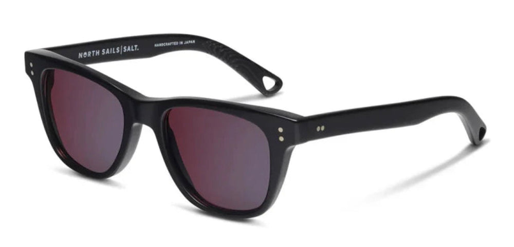 These sleek rectangular sunglasses feature a classic wayfarer-inspired design with a matte black frame. The purple-tinted lenses create a sophisticated look while offering sun protection. The frame has subtle studded details on the front corners, adding a refined touch to the minimalist design. The construction appears sturdy yet lightweight, with clean lines and a timeless silhouette suitable for any face shape.
