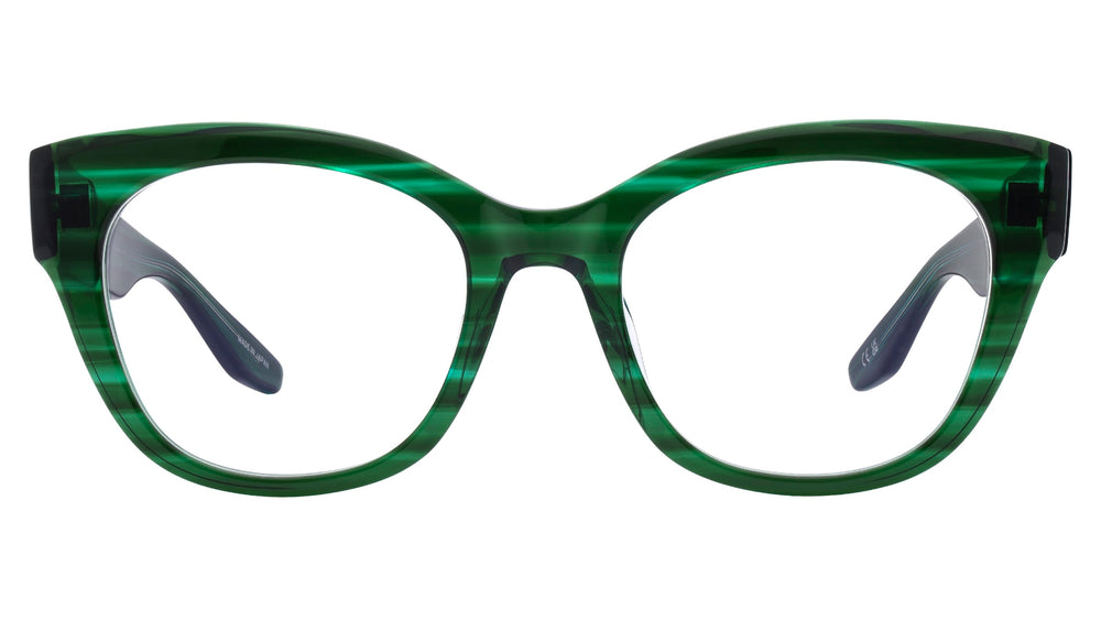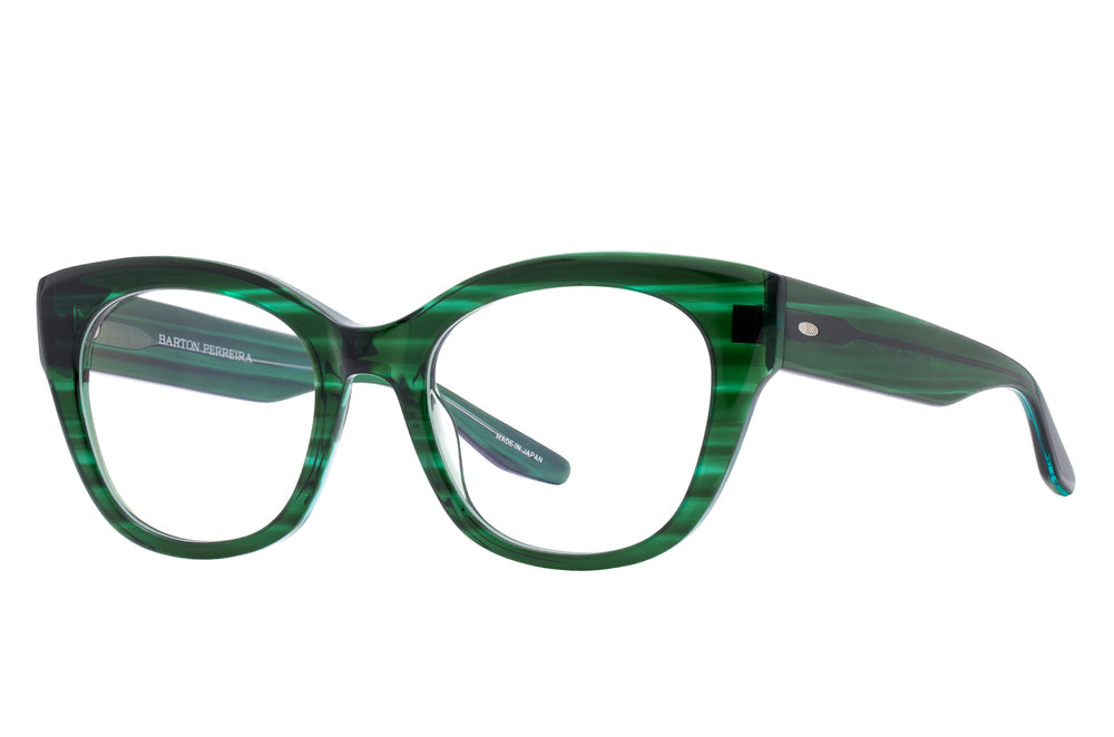 A stylish pair of oversized oval glasses featuring a striking translucent green striped acetate frame. The frame has a bold, chunky silhouette with a glossy finish that creates an elegant layered effect through the transparent material. The temples seamlessly blend with the front frame, maintaining the same luxurious green hue and substantial build. These glasses offer a sophisticated, fashion-forward look that makes a confident statement while remaining versatile enough for everyday wear.