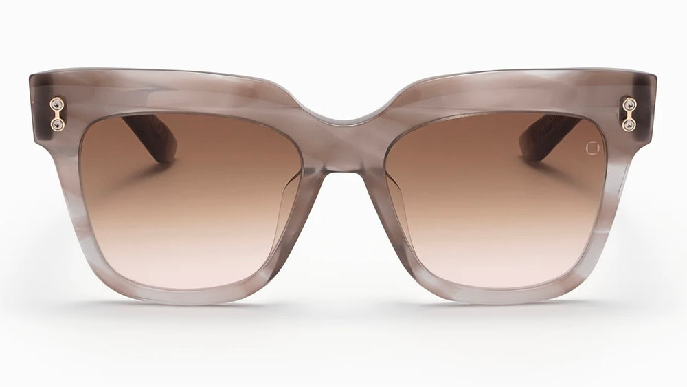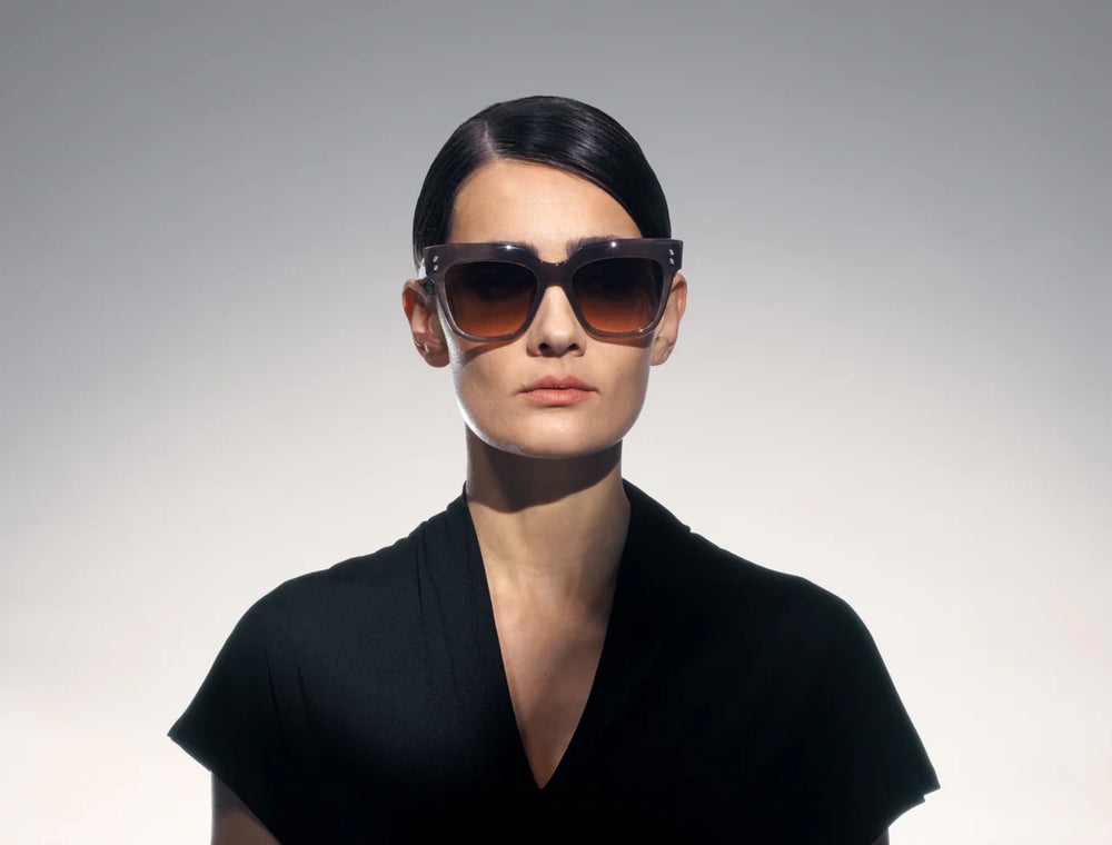 These oversized square sunglasses feature a luxurious translucent grey acetate frame with a subtle gradient effect. The thick, bold construction gives them a glamorous, statement-making presence. Small decorative metal studs adorn both temples, adding an elegant detail. The gradient brown lenses smoothly transition from dark to light, complementing the sophisticated frame design. The clean lines and modern silhouette make these sunglasses both fashionable and versatile for everyday wear.