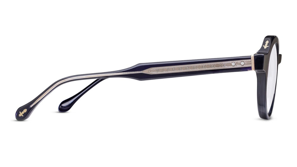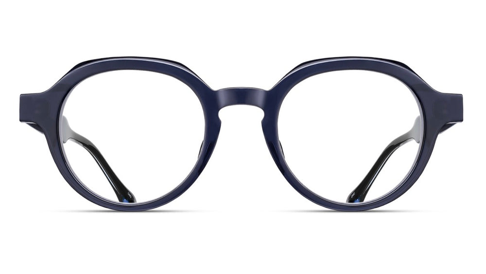 Classic round retro-inspired eyeglasses featuring a sophisticated navy blue acetate frame with substantial thickness. The design showcases a distinctive rounded silhouette with a well-balanced saddle bridge and clean lines. The frame has a matte finish and presents a refined, intellectual aesthetic that would complement both casual and formal attire. The proportions suggest a medium-to-large fit that works well with various face shapes.