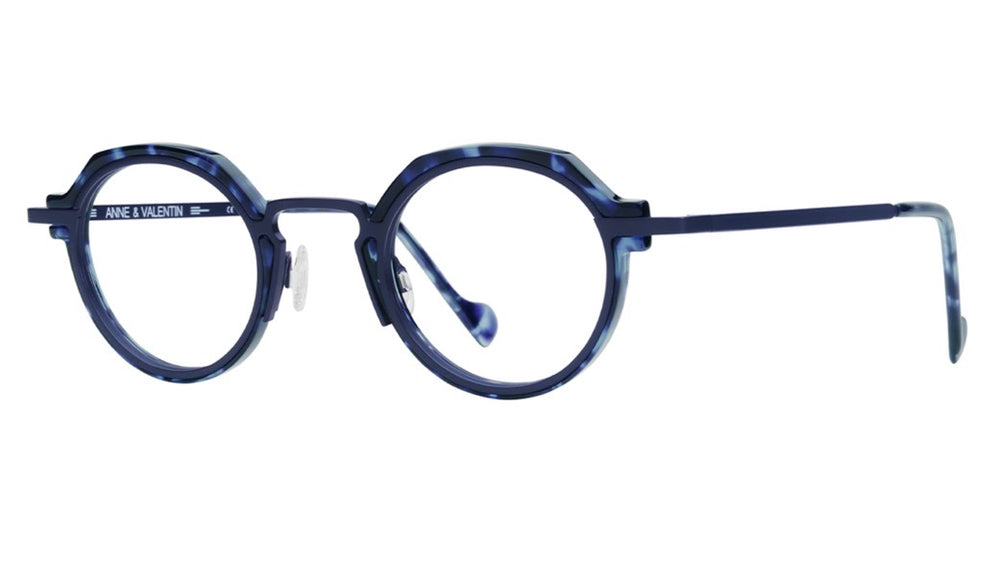 A sophisticated round-framed pair of glasses featuring a striking blue marbled acetate frame front combined with metallic elements. The design shows exceptional attention to detail with a distinctive geometric-inspired structure around the lenses. The frame has a modern yet vintage-inspired aesthetic with a beautiful tortoise-like blue pattern. The temples are sleek and minimalist, matching the overall refined design. The glasses showcase the ANNE & VALENTIN branding on the temple, indicating their premium quality and artistic French design heritage.
