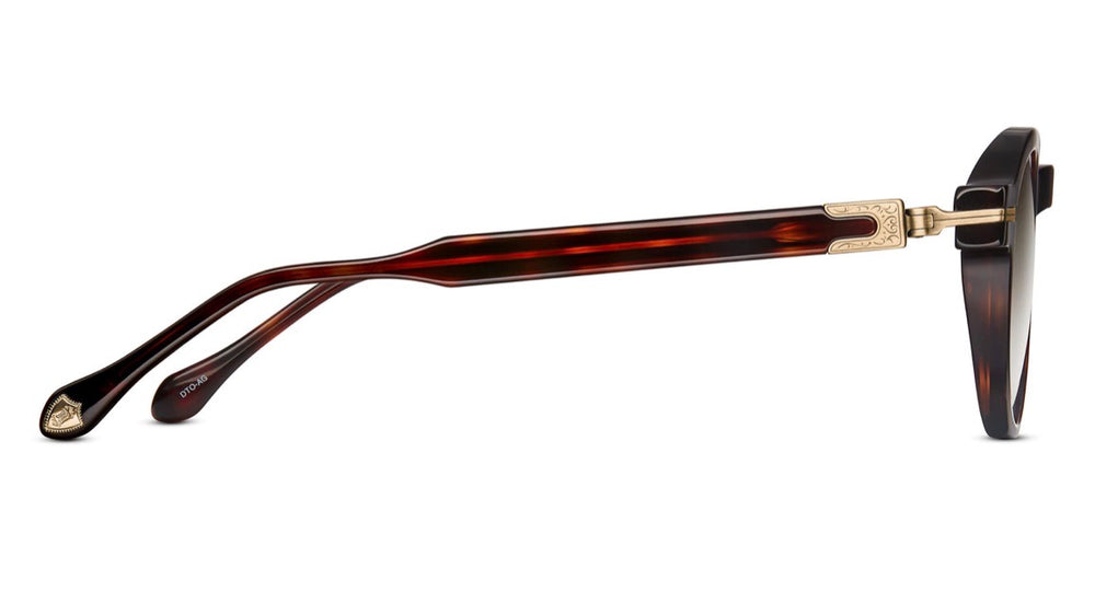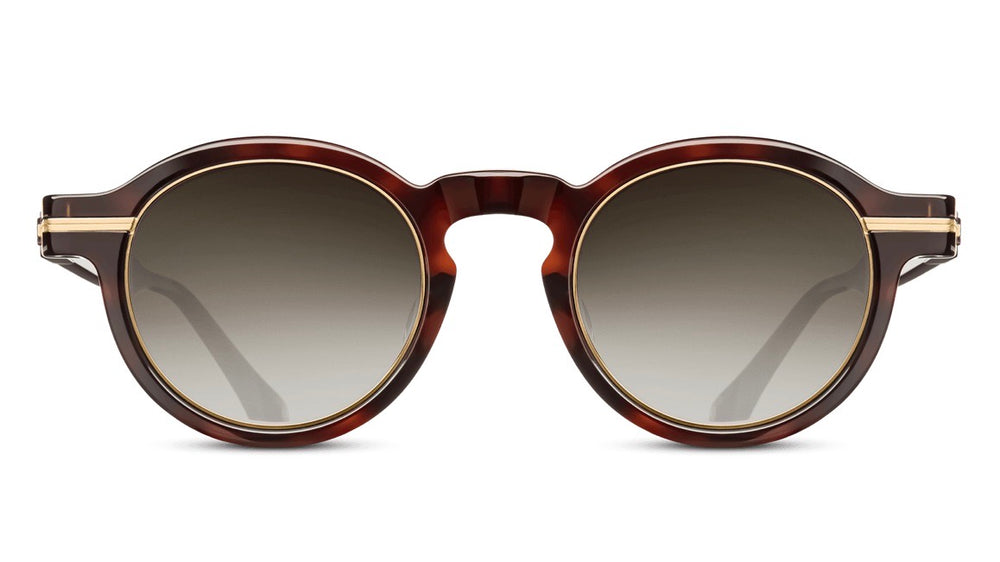 A sophisticated round-framed pair of sunglasses featuring a luxurious tortoiseshell acetate frame with gold metal accents. The design showcases elegant double bridge construction with keyhole detailing, creating a vintage-inspired silhouette. The gradient brown lenses are complemented by the warm tortoise coloring and gold metal trim details along the frame edges and temples. The sunglasses exhibit exceptional craftsmanship with smooth transitions between materials and a balanced proportion that would suit many face shapes.
