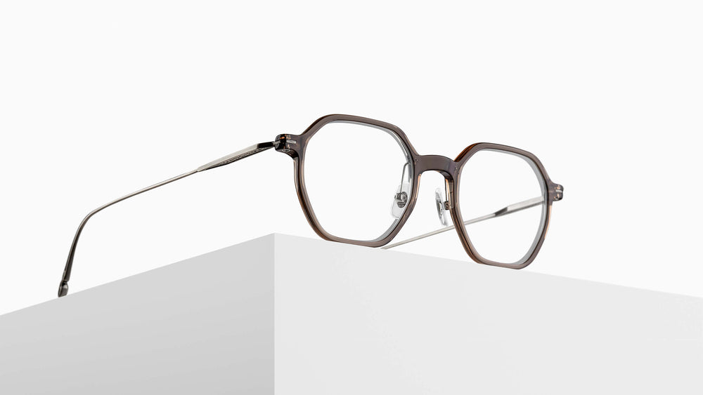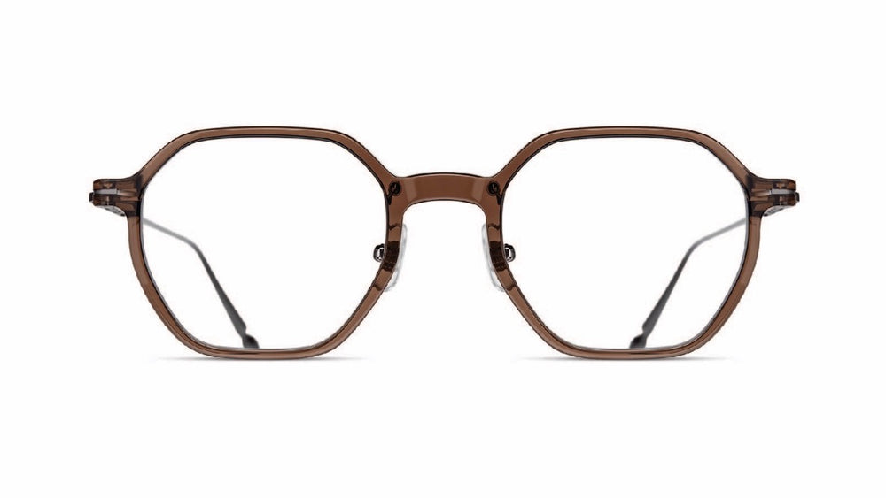 These distinctive hexagonal-shaped frames showcase a sophisticated transparent brown acetate construction with delicate metal detailing. The design features clean lines and an architectural aesthetic, with slim temple arms and a refined nose bridge system. The overall silhouette offers a contemporary take on vintage eyewear styling, perfect for those seeking a unique yet professional look. The frames have a streamlined profile that combines modern minimalism with subtle luxury details.