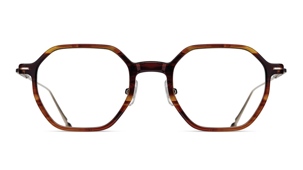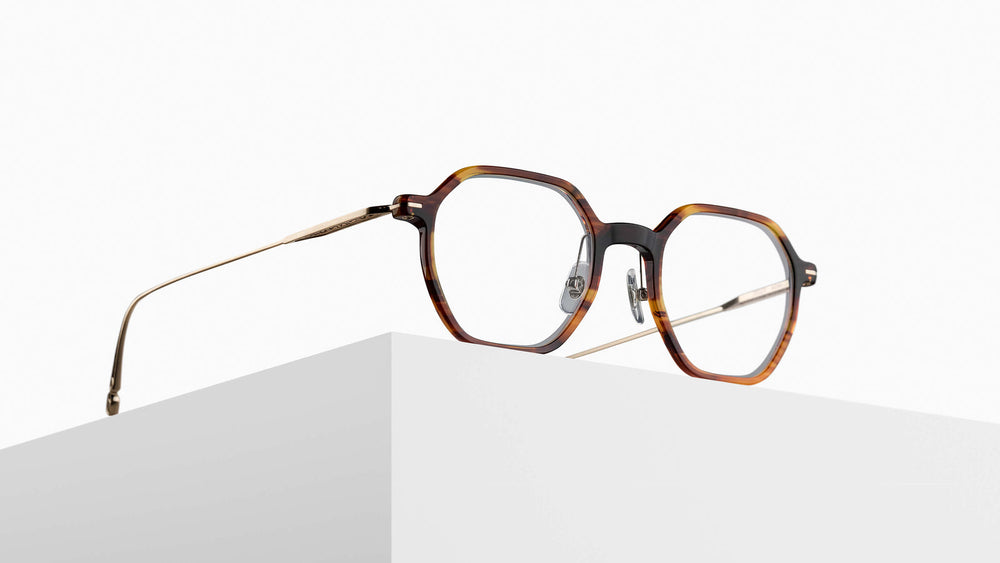 These elegant geometric-shaped glasses feature a sophisticated tortoiseshell acetate and metal combination frame. The design showcases a delicate balance between vintage and modern aesthetics, with angular geometric lines creating a distinctive silhouette. The frames demonstrate exceptional craftsmanship with fine metal detailing and a warm tortoise coloring that gradients from deep brown to amber tones. The slim profile and refined nose bridge add to its sophisticated appearance, making it a perfect choice for the style-conscious wearer who appreciates subtle luxury and architectural design elements.