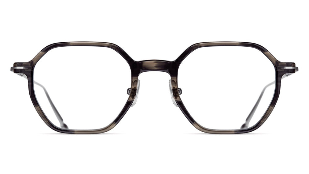 This sophisticated Matsuda frame features an angular geometric design with a distinctive hexagonal shape. The frame has a refined, brushed metallic finish in a smoky grey tone that creates an elegant gradient effect. The design combines vintage-inspired elements with modern minimalism, featuring clean lines and precise architectural details. The frames construction demonstrates exceptional craftsmanship with subtle industrial accents at the hinges and temple joints. The overall aesthetic is understated yet luxurious, perfect for the discerning wearer who appreciates artisanal quality and contemporary design.
