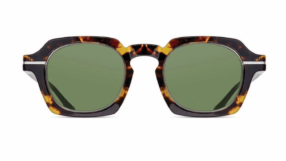 These are distinctive geometric-shaped sunglasses featuring a bold tortoiseshell acetate frame with angular edges and sharp corners. The design showcases a unique architectural aesthetic with a thick frame construction and striking green lenses. The sunglasses combine vintage inspiration with modern sophistication, featuring subtle metal accents and a balanced proportional design that makes a strong fashion statement while maintaining wearability.