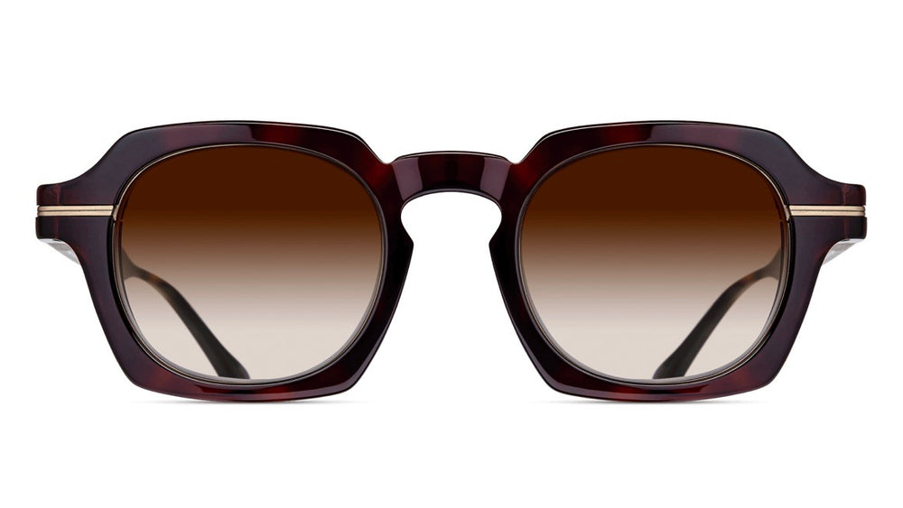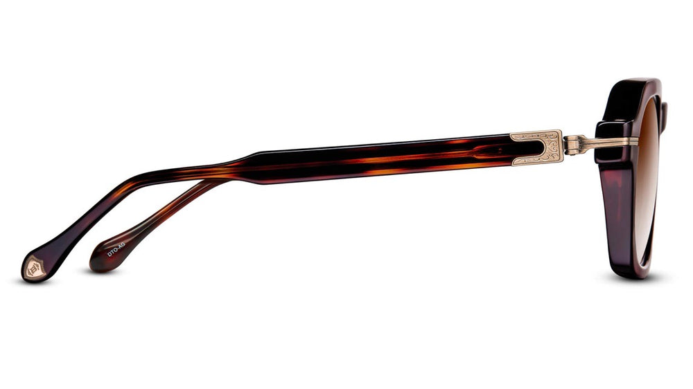 These luxury geometric sunglasses feature a bold, angular tortoiseshell acetate frame with distinctive architectural details. The frame showcases a deep burgundy-brown tortoise pattern with subtle gold metal accents along the temples. The gradient brown lenses complement the frames rich coloring. The design exhibits premium craftsmanship with its precise geometric angles and balanced proportions, creating a sophisticated, avant-garde aesthetic thats both striking and wearable. The saddle bridge provides comfortable fit, while the metal temple arms add a refined touch with their slim gold finish.