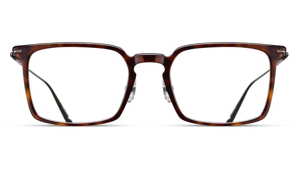These refined rectangular MATSUDA frames showcase exquisite craftsmanship with a sophisticated tortoiseshell acetate front and sleek metal temple arms. The glasses feature a clean, architectural design with subtle metallic accents at the hinges and temple tips. The thin profile and warm brown tones create an elegant, intellectual aesthetic suitable for both professional and casual wear. The frames demonstrate Japanese-inspired minimalism while maintaining luxurious attention to detail in the finishing and construction.