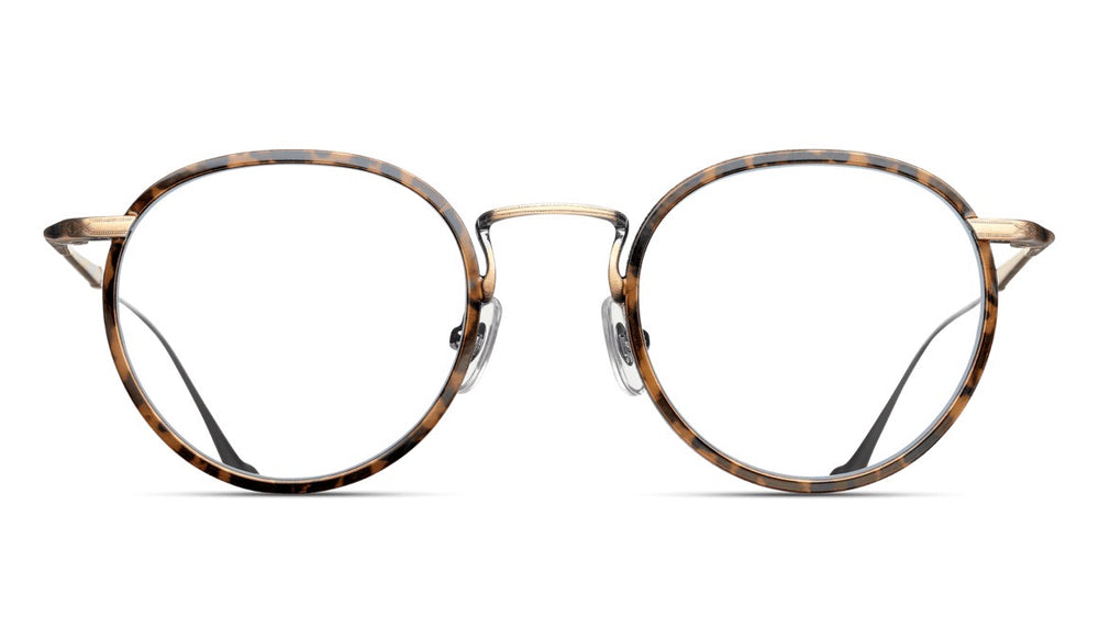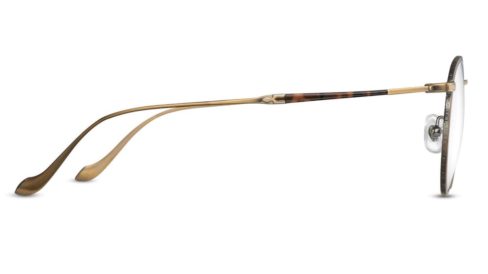 These elegant round frames feature a sophisticated tortoiseshell pattern rim with delicate gold metal accents. The design combines vintage aesthetics with modern refinement, featuring thin metal temple arms and a sleek nose bridge. The intricate detailing and high-quality construction exemplify luxury eyewear craftsmanship, with the tortoise pattern showing subtle variations in amber and dark brown tones. The proportions are well-balanced, making them suitable for various face shapes while maintaining a timeless appeal.