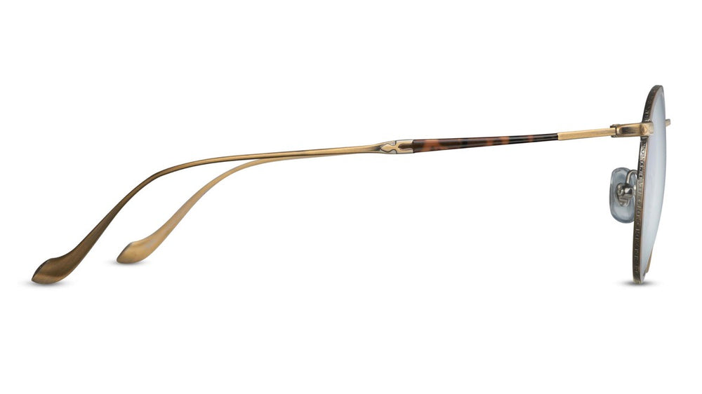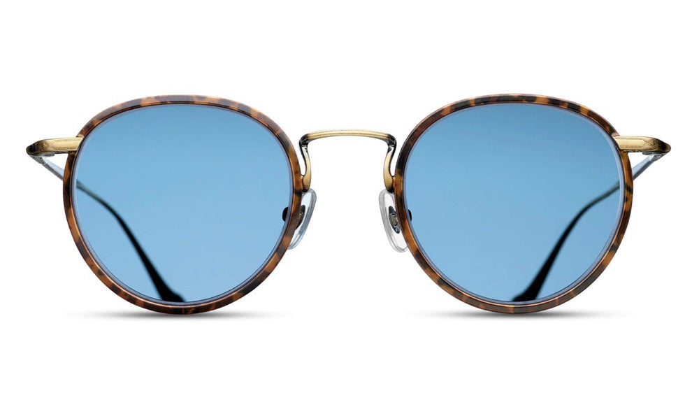 These are elegant round sunglasses featuring a tortoiseshell acetate rim combined with gold-tone metal details. The frame showcases a sophisticated fusion of vintage and modern design elements, with delicate metal temple arms and nose pads. The light blue-tinted lenses are perfectly complemented by the warm tortoise pattern of the frame. The overall design exhibits exceptional craftsmanship with refined details and proportions, characteristic of high-end eyewear. The silhouette appears to be inspired by classic 1920s eyewear while maintaining a contemporary appeal.