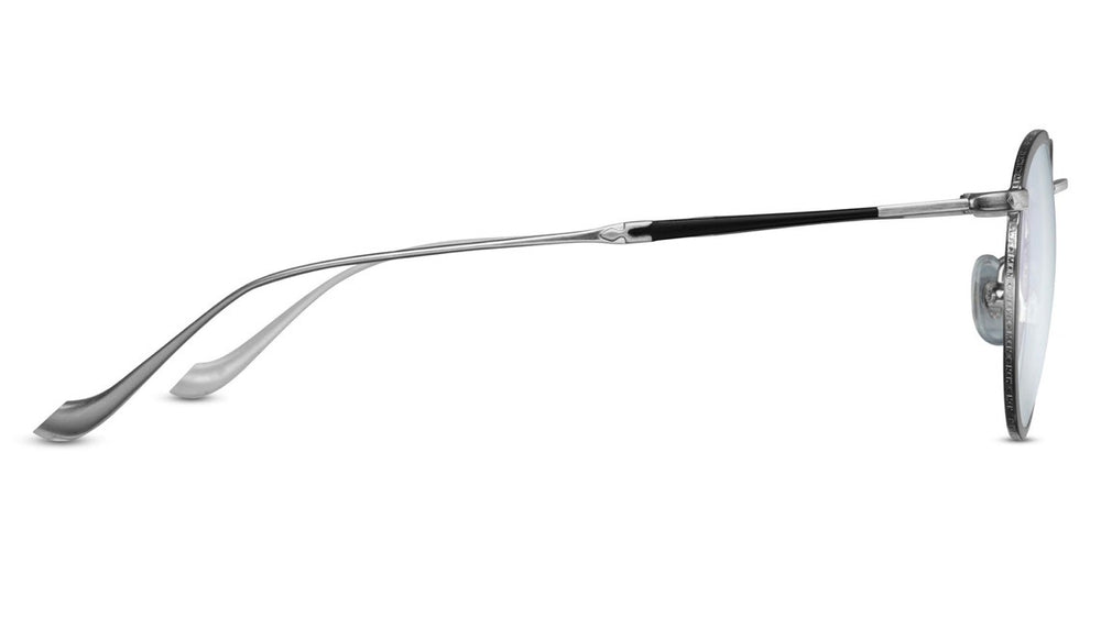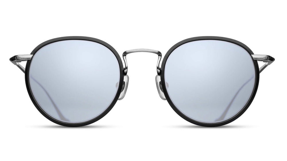 These sophisticated round sunglasses feature a sleek metal construction with a matte black frame rim and polished silver accents on the bridge and temple arms. The design showcases a minimalist yet luxurious aesthetic with delicate nose pads and slim temple arms. The mirrored grey lenses complement the frames contemporary styling, making these sunglasses both fashionable and functional. The proportions are well-balanced, with the round shape lending a timeless quality that works well for various face shapes. The craftsmanship is evident in the precise detailing and smooth finishing of all metal components.